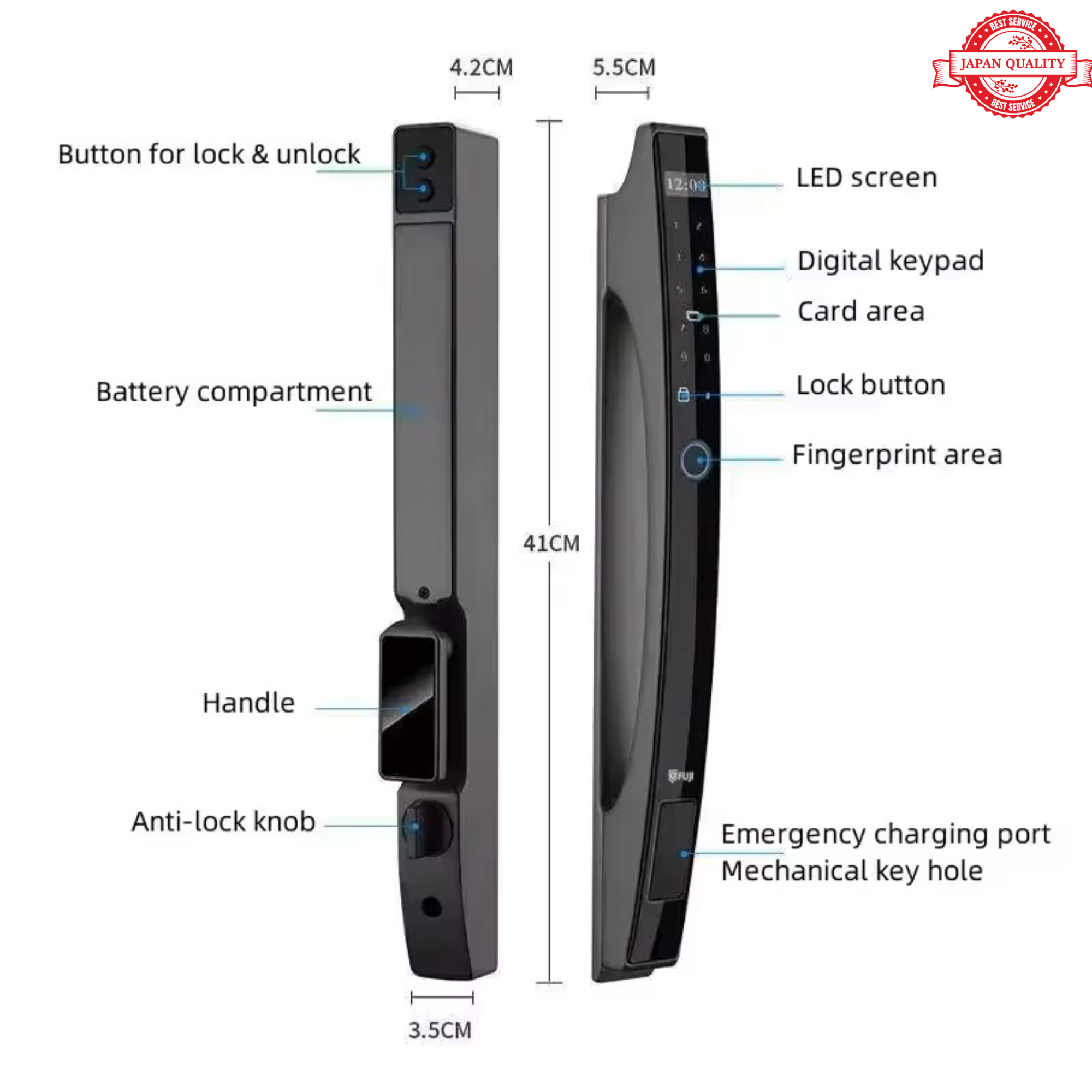 - 高度な指紋認識テクノロジー、静電容量式タッチ、温度、圧力に基づく指紋認識。0.5秒以内に指紋を認識し、偽造指紋を完全に防止します。